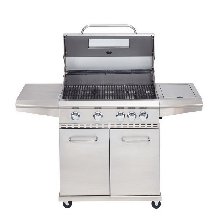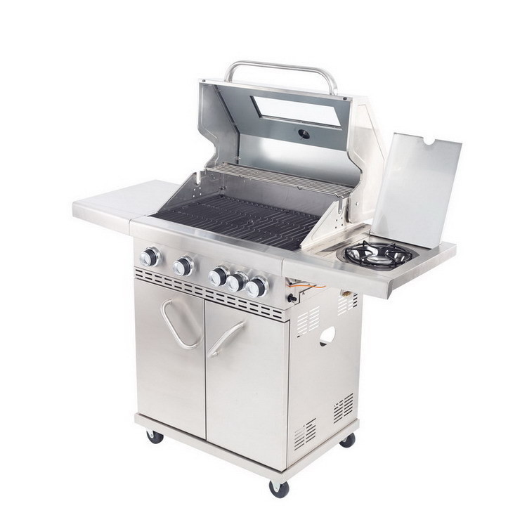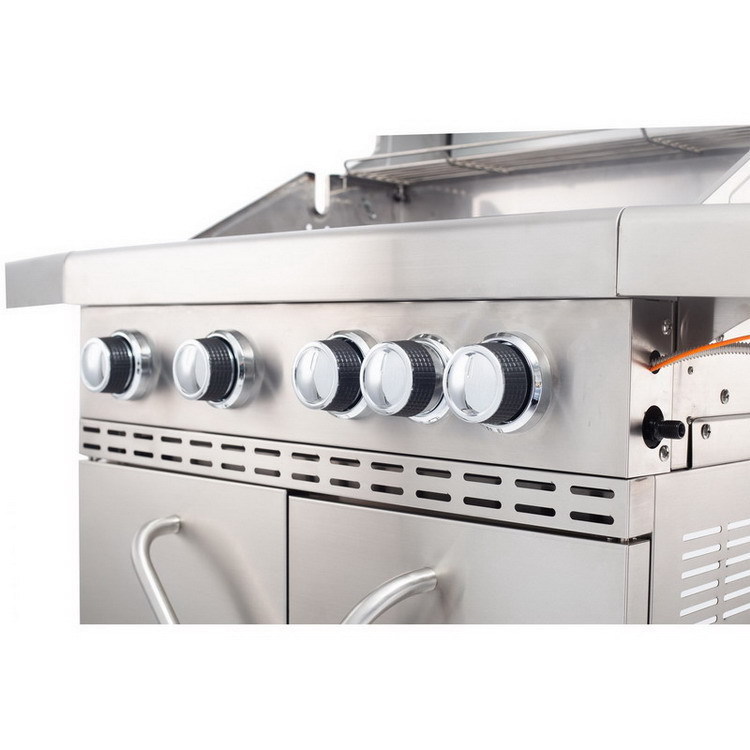 1. Primaire 312-square-inch kookruimte en 73-square-inch verwarming rek 2. met porseleinen glazuur bekleed gietijzeren kookgaten 3- Verwarmingsrek van roestvrij staal 4. constructiecarosserie van roestvrij staal 5. branders van roestvrij staal, elk 12000 BTU, zijbranders met 11000 BTU 6Afneembare vetpan van achter de BBQ 7De linkerkant van het roestvrijstalen plank biedt meer duurzaamheid en voldoende werk- en voorbereidingsruimte. 8. met vier trolley wielen ontwerp, gemakkelijk te verplaatsen van en naar 9De op het deksel gemonteerde temperatuursmeter zorgt voor een grotere beheersing van de warmte. 10. Piezo ontstekingssysteem, gemakkelijk te starten 11Een deurkas voor gasflessen of voor het opslaan van materialen |