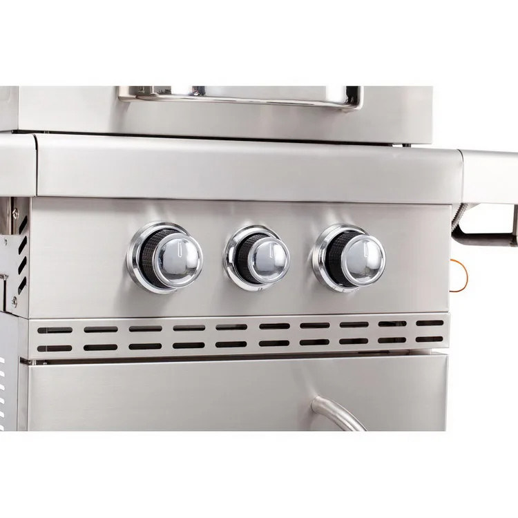 1. Primaire 312-square-inch kookruimte en 73-square-inch verwarming rek 2. met porseleinen glazuur bekleed gietijzeren kookgaten 3- Verwarmingsrek van roestvrij staal 4. constructiecarosserie van roestvrij staal 5. branders van roestvrij staal, elk 12000 BTU, zijbranders met 11000 BTU 6Afneembare vetpan van achter de BBQ 7De linkerkant van het roestvrijstalen plank biedt meer duurzaamheid en voldoende werk- en voorbereidingsruimte. 8. met vier trolley wielen ontwerp, gemakkelijk te verplaatsen van en naar 9De op het deksel gemonteerde temperatuursmeter zorgt voor een grotere beheersing van de warmte. 10. Piezo ontstekingssysteem, gemakkelijk op te starten 11. Een deur kast voor stand gascilinder of opslaan materialen |